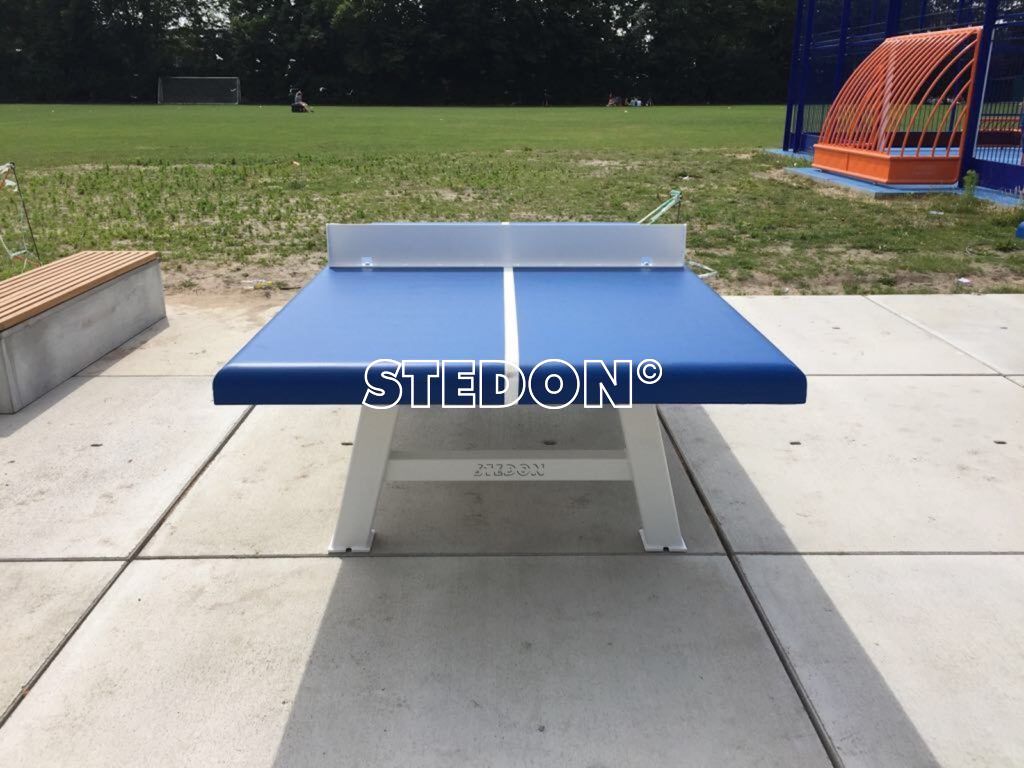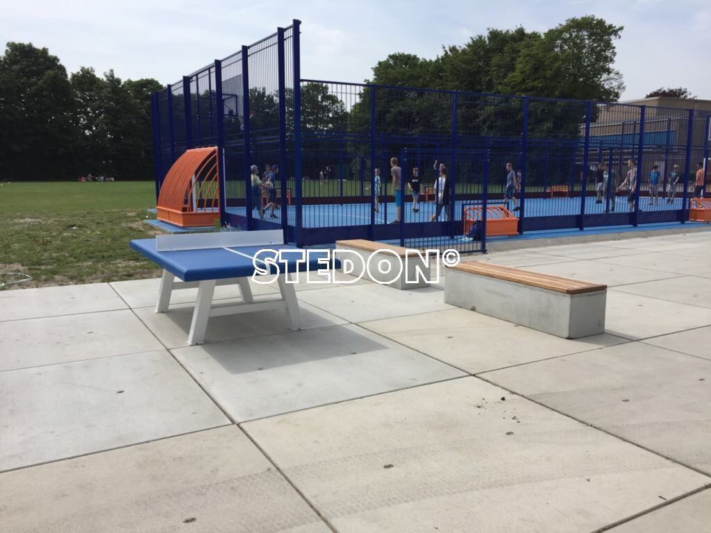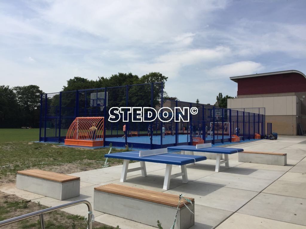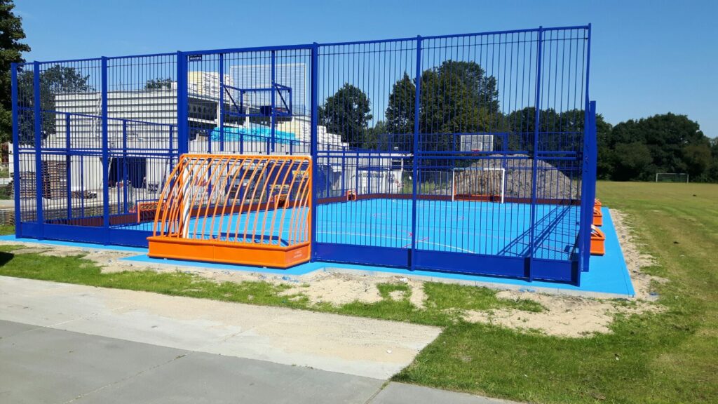Op het plein staat een blauwe sportkooi waar de kinderen wel vier verschillende sporten in kunnen beoefenen. De sportkooi heeft een combidoel, hierdoor kunnen de kinderen zowel voetballen als basketballen. In de zijkanten van de sportkooi zijn aan iedere zijde drie pannadoelen verwerkt. Dit zorgt ervoor dat er panna gespeeld kan worden. En doordat er hockey boarding rondom in de kooi is aangebracht behoord ook hockey tot de mogelijkheid.