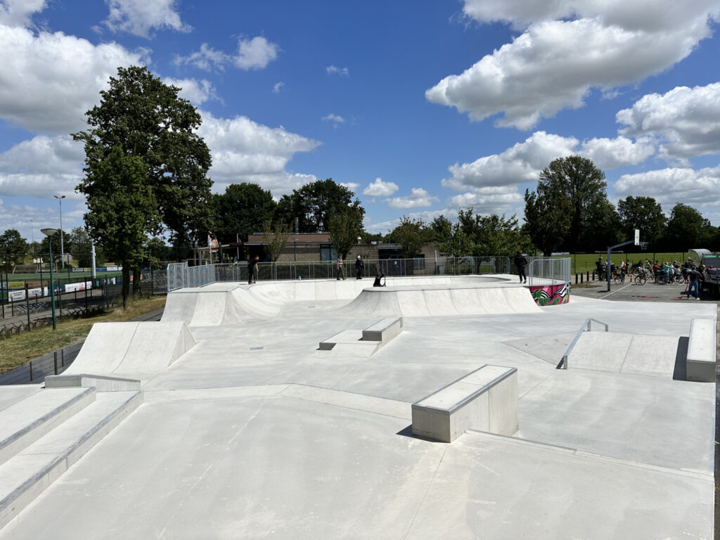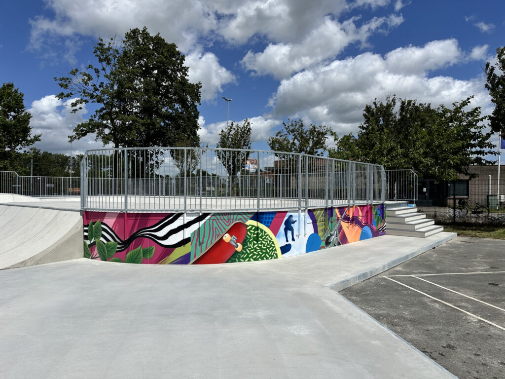 De ontwikkeling van het skatepark is gedaan door adviesbureau Speelplan. Zij hebben in samenspraak met de lokale jeugd en bewoners een ontwerp gemaakt voor het nieuwe skatepark en hebben ons vervolgens benaderd voor de uitvoering. Wij hebben het ontwerp omgezet in een uit te voeren plan en hebben in juni dit nieuwe skatepark met onder andere een skatebowl, spineramp, curb met ledge, funbox met rail en een platform met diverse banks en stairs geplaatst. De hoogtes van 0,6 meter tot 1,25 meter bieden toegankelijke mogelijkheden voor beginners en ook een ervaren skater kan genoeg lol beleven.