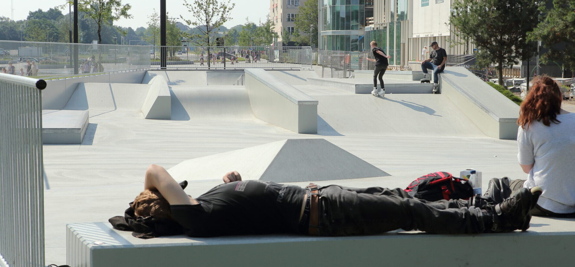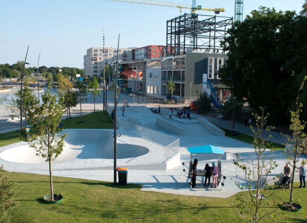 Het centrumplein in Emmen heeft een metamorfose ondergaan, met als doel een levendige ontmoetingsplaats te creëren die een mix biedt van groen, water en recreatie. Als bijdrage aan dit project hebben wij een sundeck geleverd, dat als een boemerang door het plein slingert, en een skatepark met een indrukwekkende oppervlakte van 800 m2.