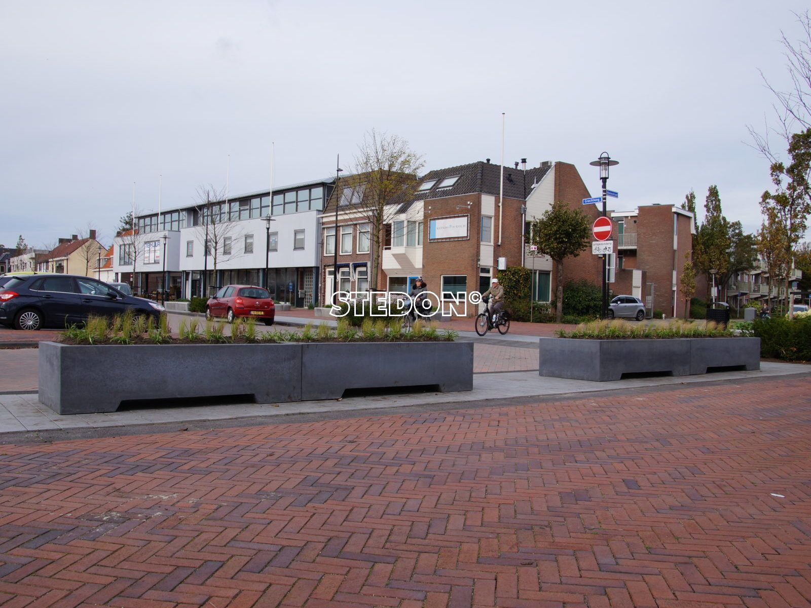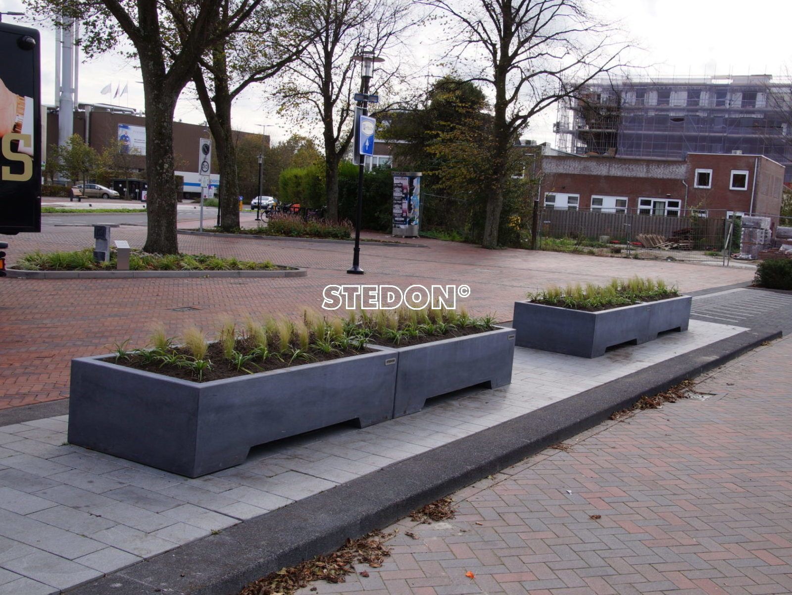 In Lisse zijn 4 stuks betonnen bloembakken geleverd met een afmeting van 200 x 100 x 45 cm. De bloembakken zijn voorzien van ontwateringsgaten en hebben aan de onderkant een opening ten behoeve van vorklift lepels.