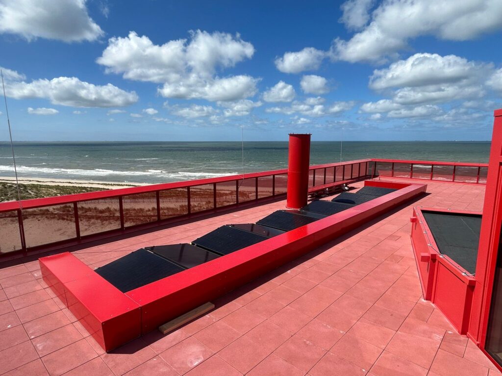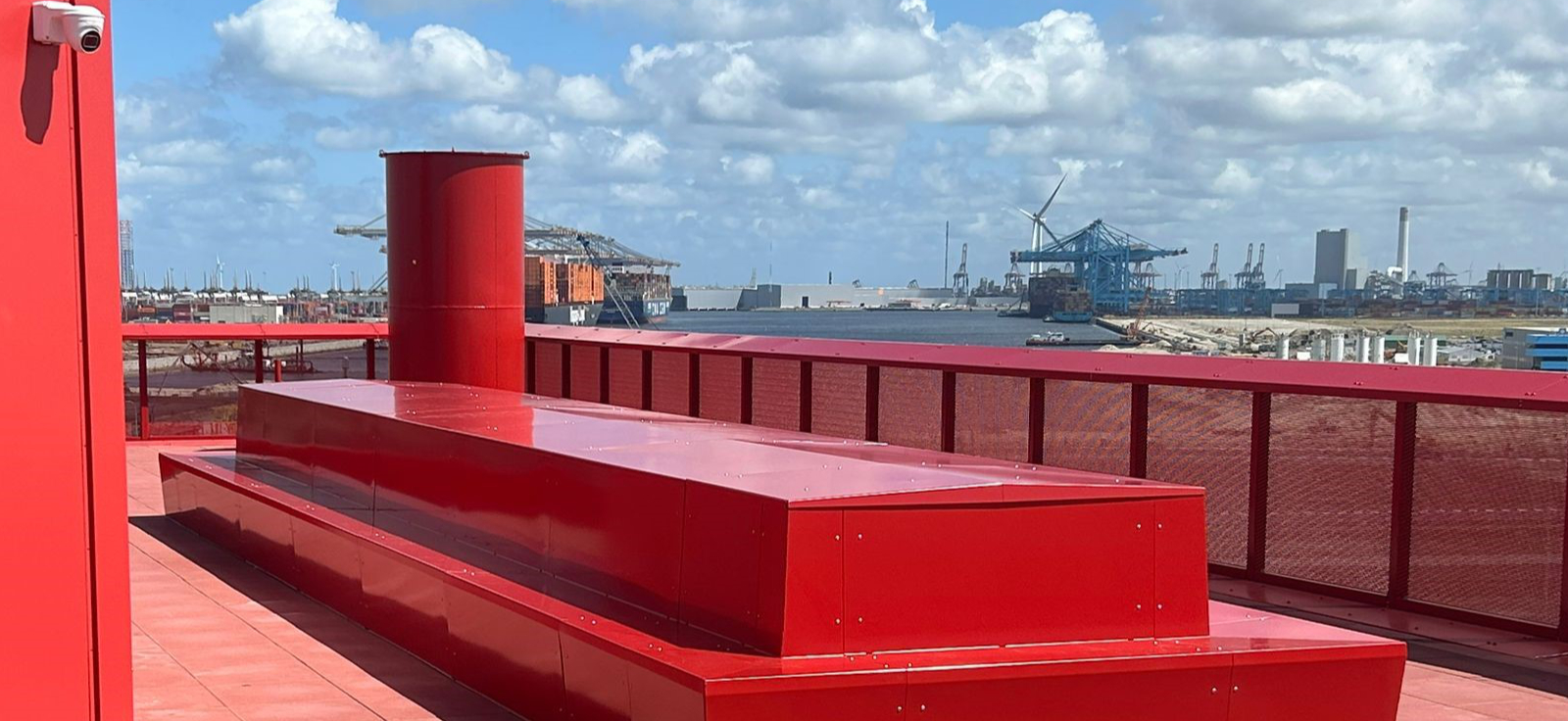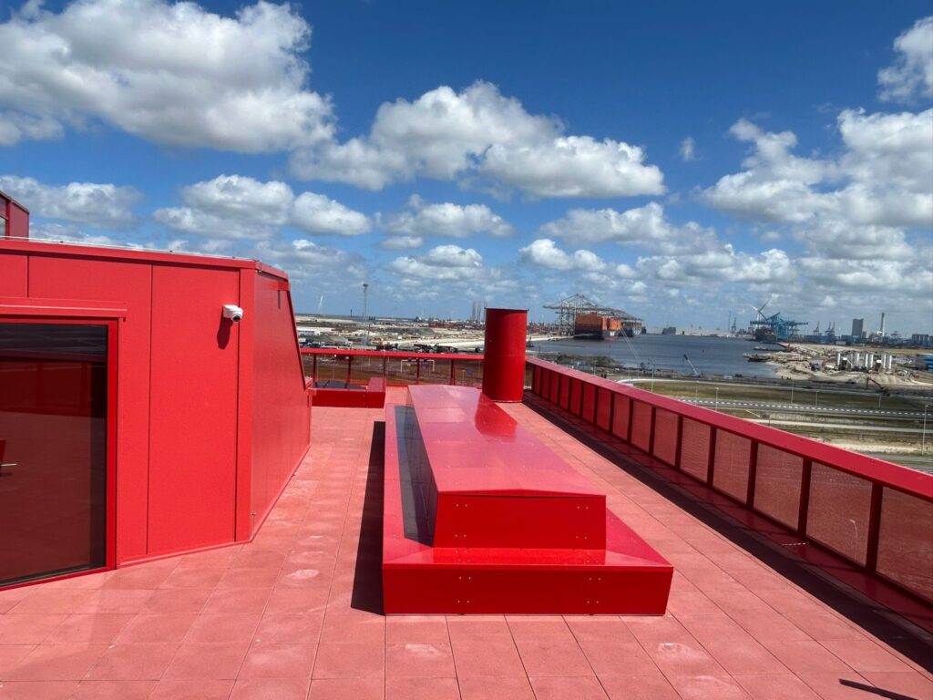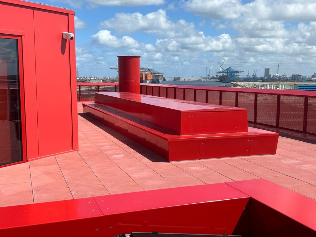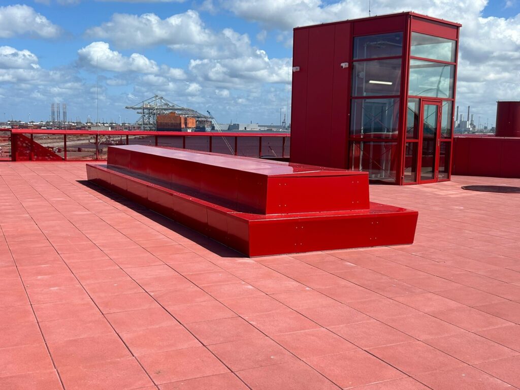 Voor dit knalrode dakterras hebben wij net zo knalrode banken mogen fabriceren naar ontwerp van de architect. Het ontwerp doet ons een beetje denken aan een containerschip, zou dat het idee geweest zijn?