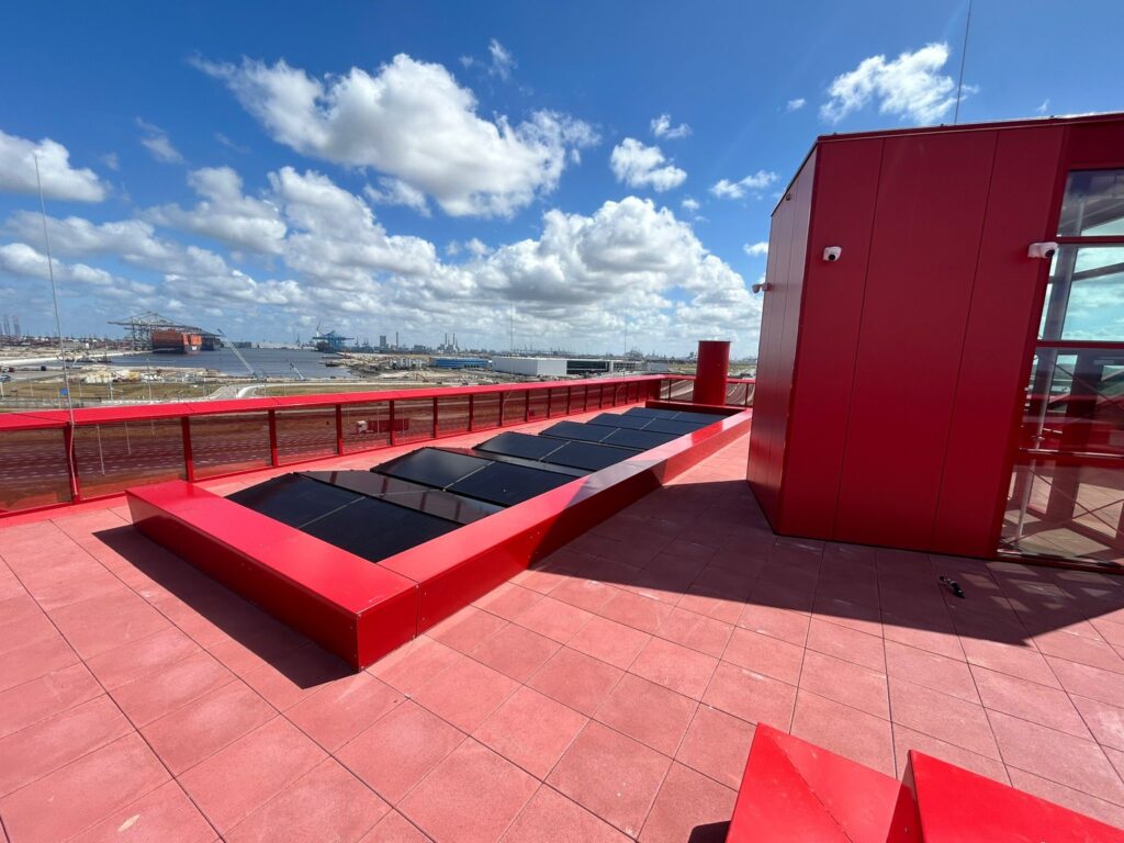 Portlantis is vormgegeven als 5 op elkaar gestapelde “dozen”. Een markante rode trap leidt bezoekers naar het dakterras vanwaar ze uitzicht hebben op de indrukwekkende industiehaven van Rotterdam.