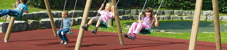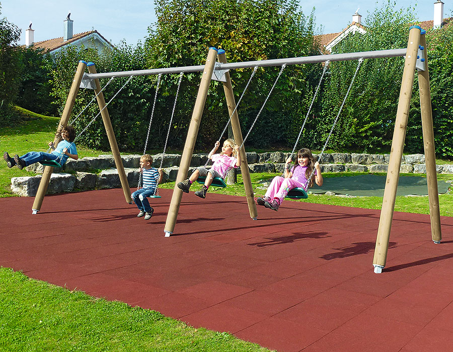 Schommelframe van drukgeïmpregneerd, meervoudig verlijmd Zwitsers grenenhout, RVS ophangvoorziening voor vier zitplaatsen, thermisch verzinkte stalen buis en hoekverbinders, inclusief stalen voetbeugels voor een minimale inbouwdiepte van 50 cm.