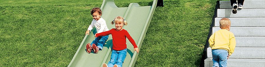 Dubbele glijbaan voor installatiehoogte 150 cm, kuiplengte 300 cm, gemaakt van groen polyester, gescheiden door middenbalk, inclusief stalen voetconsole voor minimale installatiediepte van 50 cm.