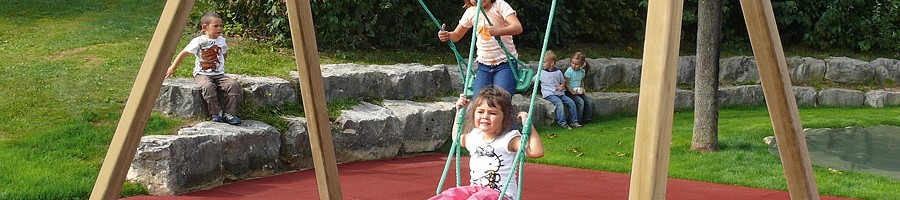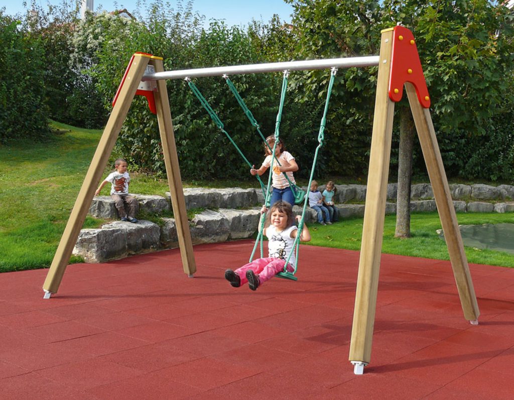 Schommelframe van drukgeïmpregneerd, meervoudig verlijmd Zwitsers grenenhout, RVS ophangvoorziening voor twee zitplaatsen, thermisch verzinkte stalen buis en hoekverbinder, inclusief stalen voetbeugels voor een minimale inbouwdiepte van 50 cm.