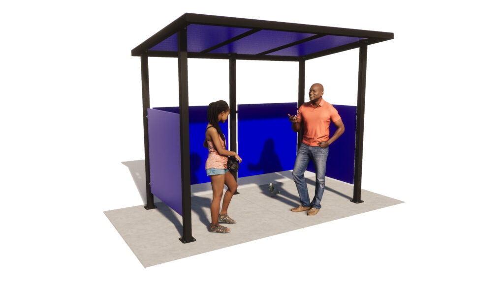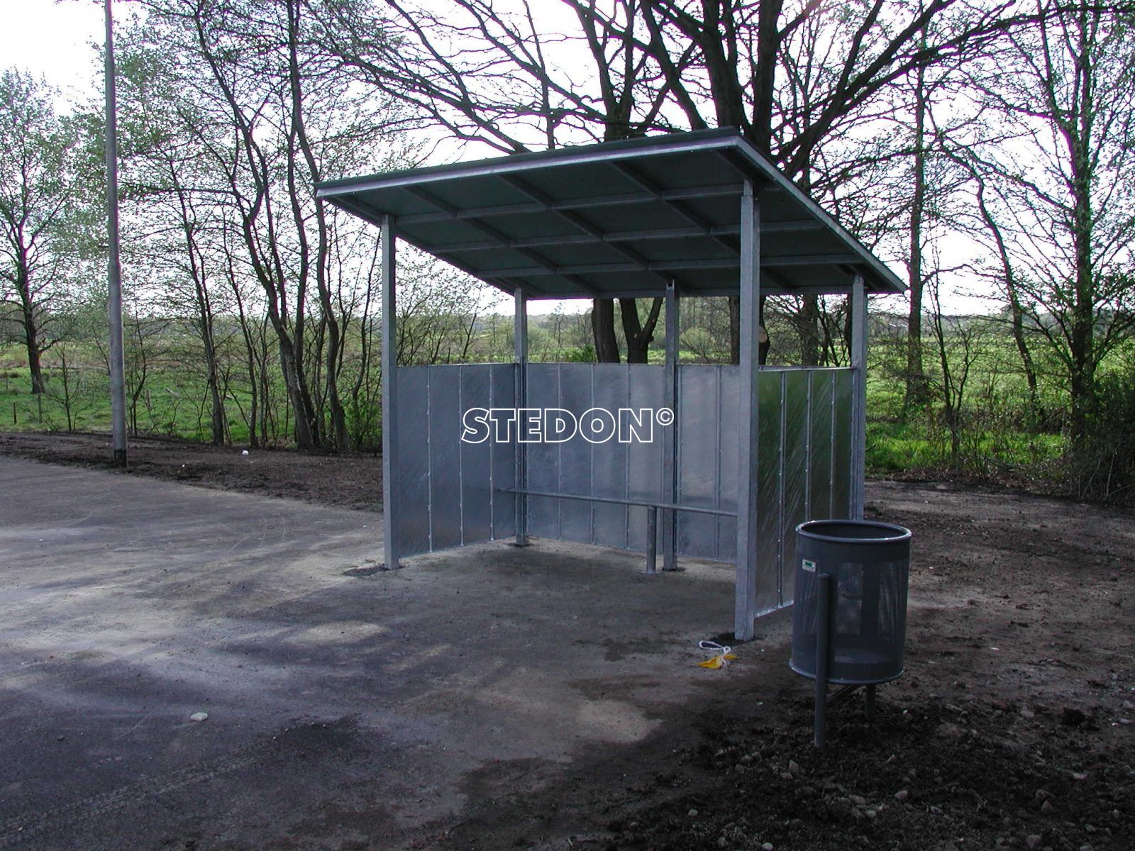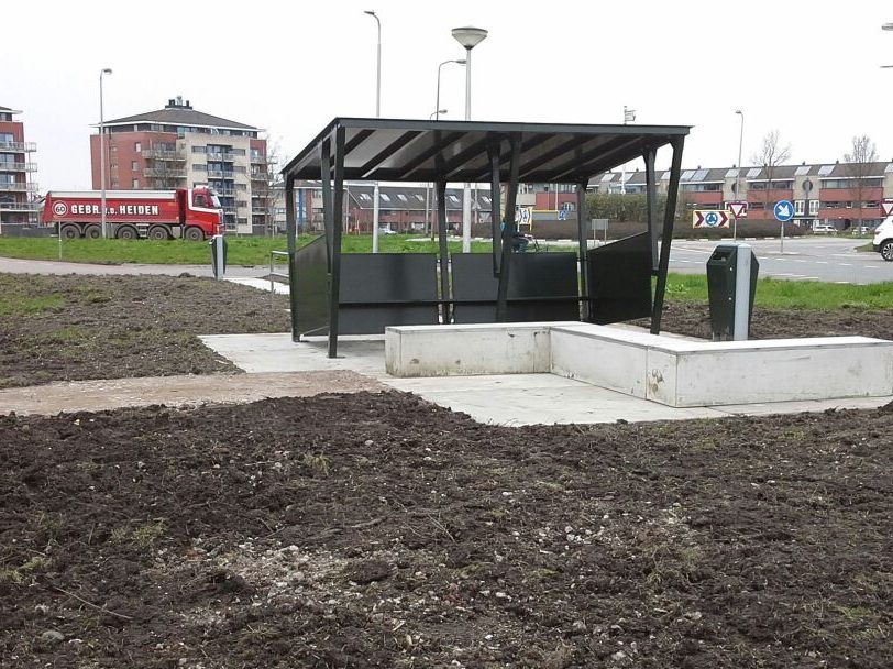 Dit model biedt beperkte beschutting tegen wind en water door de halve wanden en is daarmee geschikt voor korte momenten van samenkomst. De wanden, het dak en de tafels kunnen worden uitgevoerd worden in kleur naar keuze.