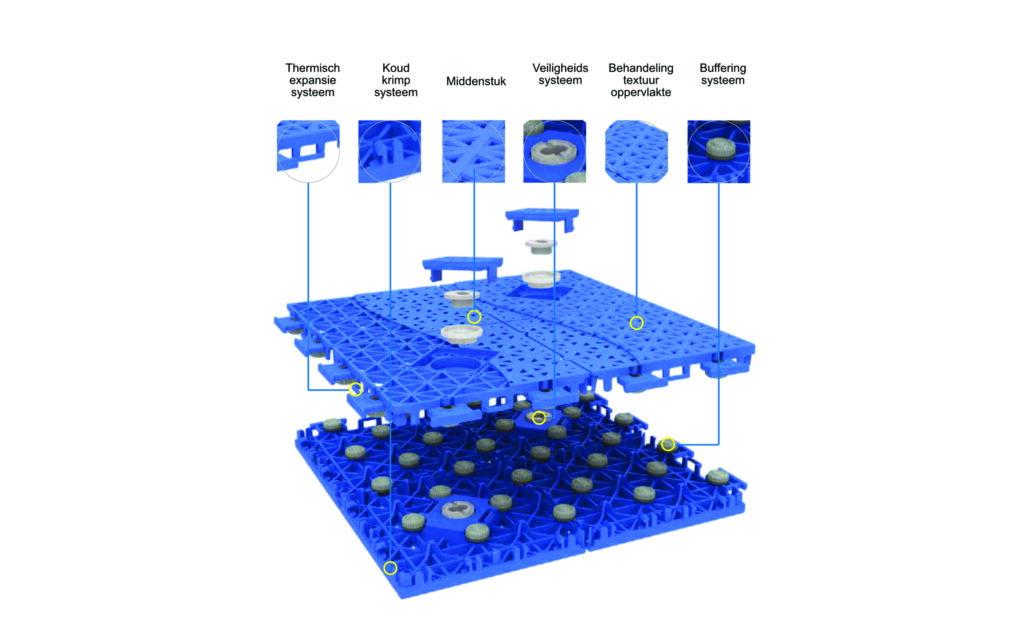 Onder de basketbalvloer bevinden zich schokdempers van zeer elastisch, grofkorrelig golfmateriaal. Met een schokabsorptievermogen van 50% biedt deze vloer optimale bescherming voor de beengewrichten.