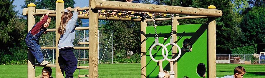• Klimtoestel combinatie van drukgeïmpregneerd, meervoudig verlijmd Zwitsers grenenhout, dubbele wandrails, klimwand, netoverkapping, polyamide turnringen met roestvrijstalen kettingen en touwladder, inclusief stalen voetbeugels voor een minimale inbouwdiepte van 50 cm.