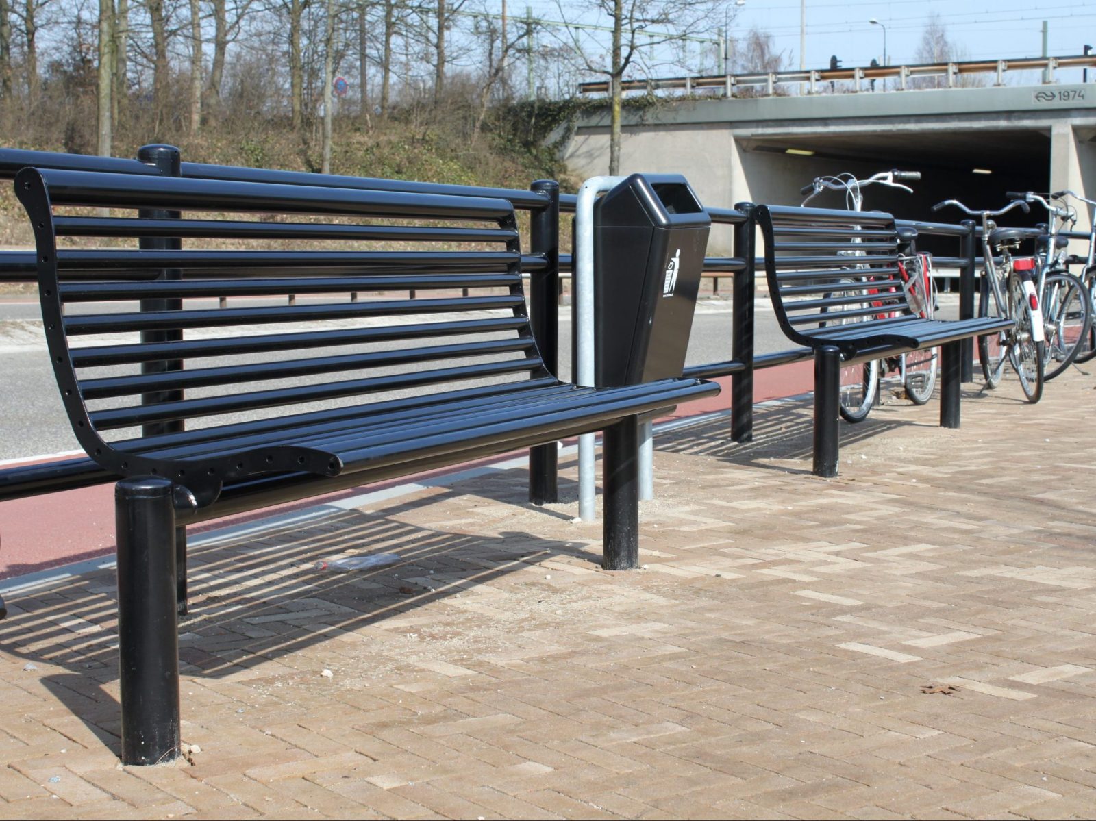 De zitting en rugleuning zijn opgebouwd uit slanke, voorgevormde stalen latten die optimaal zitcomfort combineren met duurzaamheid. De verticale poten geven de bank een stevig en stabiel karakter. Het geheel is thermisch verzinkt en afgewerkt met een poedercoating, wat zorgt voor uitstekende bescherming tegen weersinvloeden en slijtage. Dankzij deze hoogwaardige afwerking blijven de banken er jarenlang representatief uitzien, zelfs bij intensief buitengebruik.