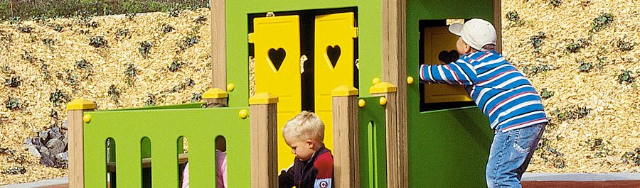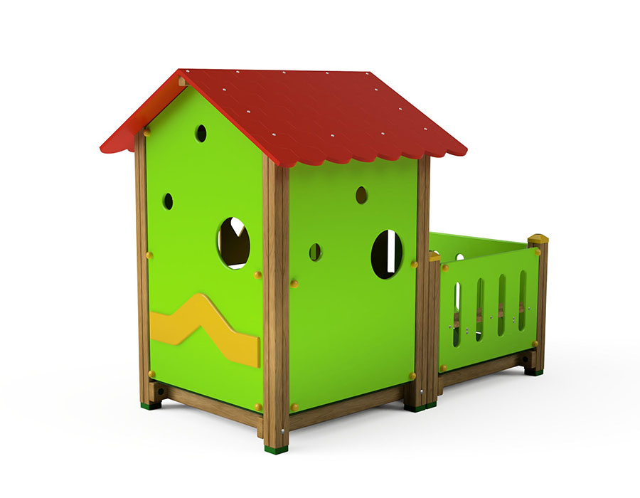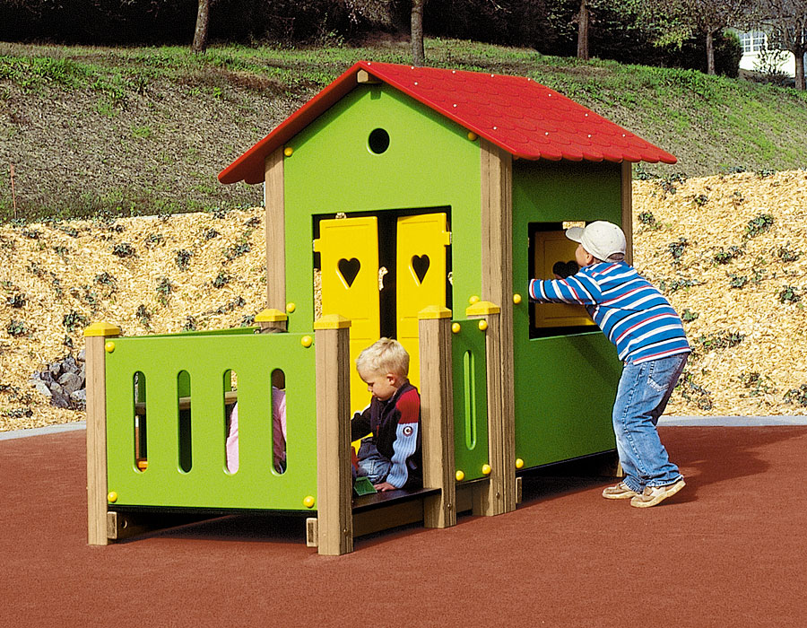 Dwerghuis met veranda van meervoudig verlijmd Zwitsers grenen, drukgeïmpregneerd, met zadeldak, binnenbank, toegangsdeur en luiken, vrij in te richten.
