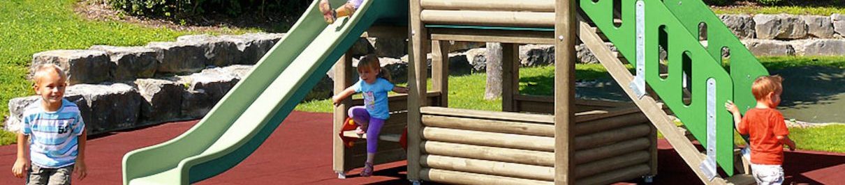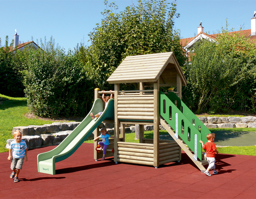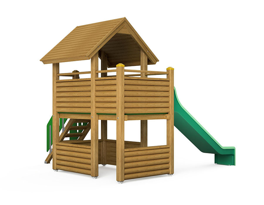 Vikingtoren van meervoudig verlijmd Zwitsers grenen, drukgeïmpregneerd, platformhoogte 150 cm, met zadeldak, balkon, glijbaan van groen polyester, toegangstrap, oorbank, incl. stalen voetbeugels voor minimale inbouwdiepte 50 cm.