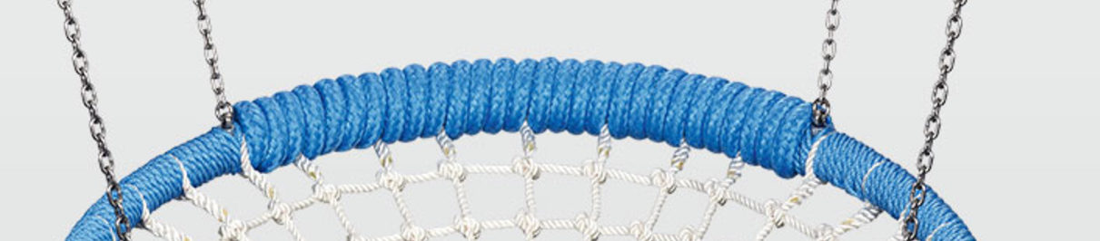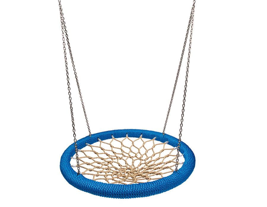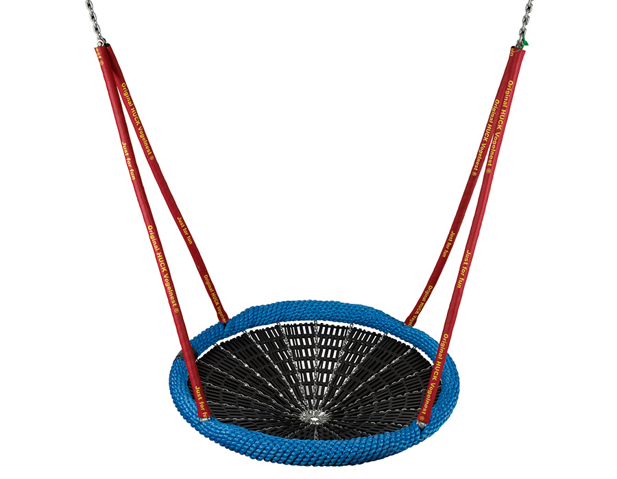 • E00335: Vogelnest Original Huck, diameter ø 125 cm, mat van kunststof schakels, blauwe touwring, met thermisch verzinkt kettingbeslag en rode beschermhoes.
