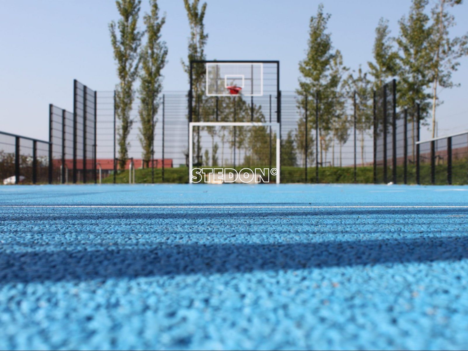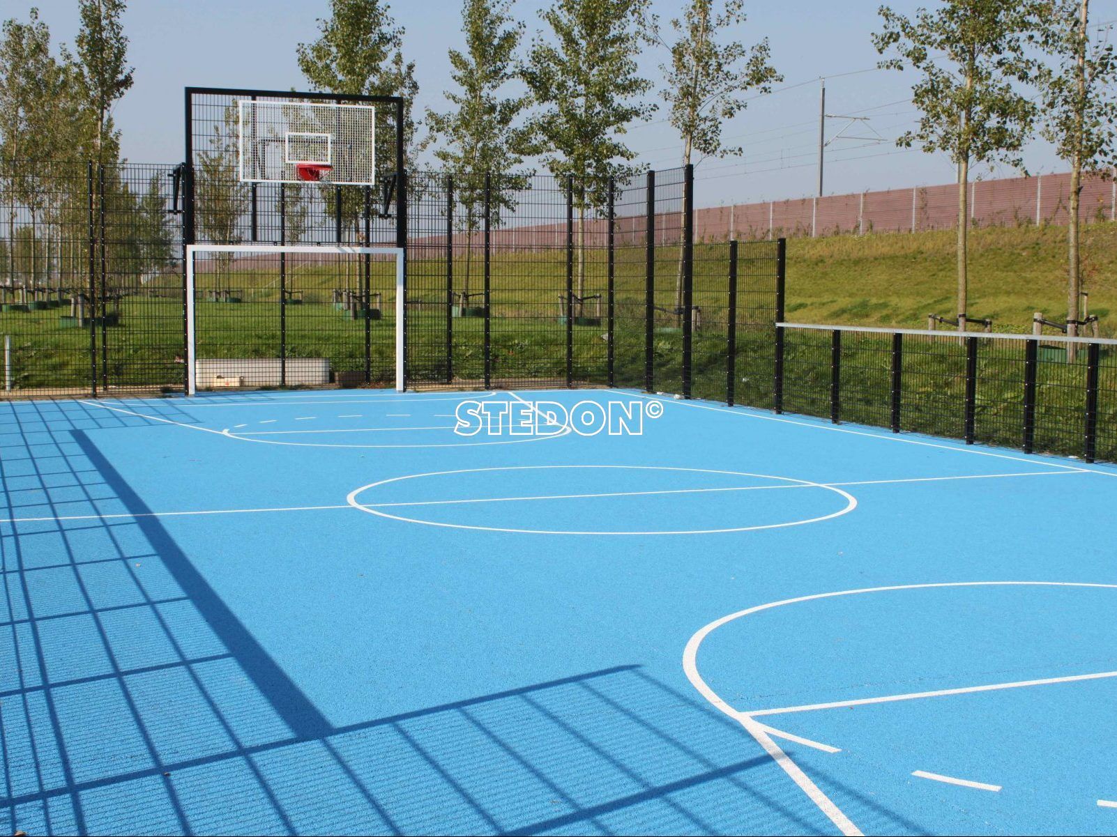 In Dronten is een DSM sportkooi met blauwe drainbeton sportloer geleverd. Op de sportvloer is voetbal en basketbal belijning aangebracht.