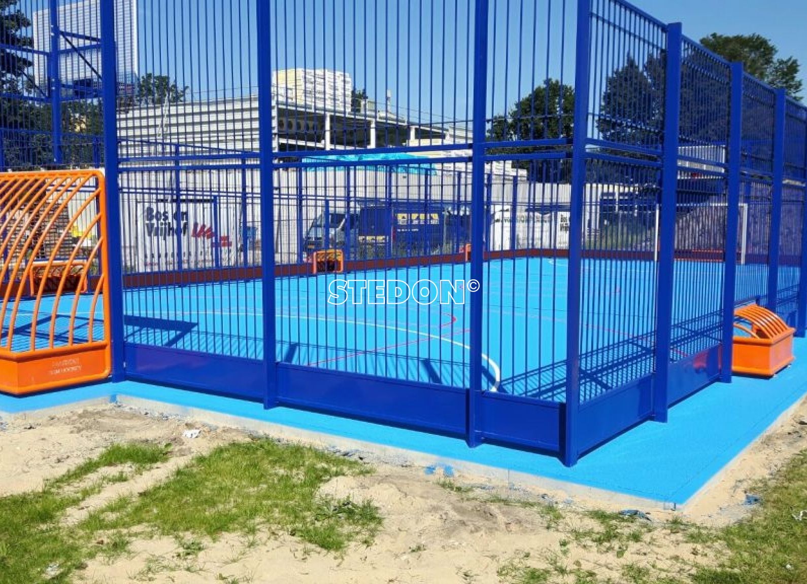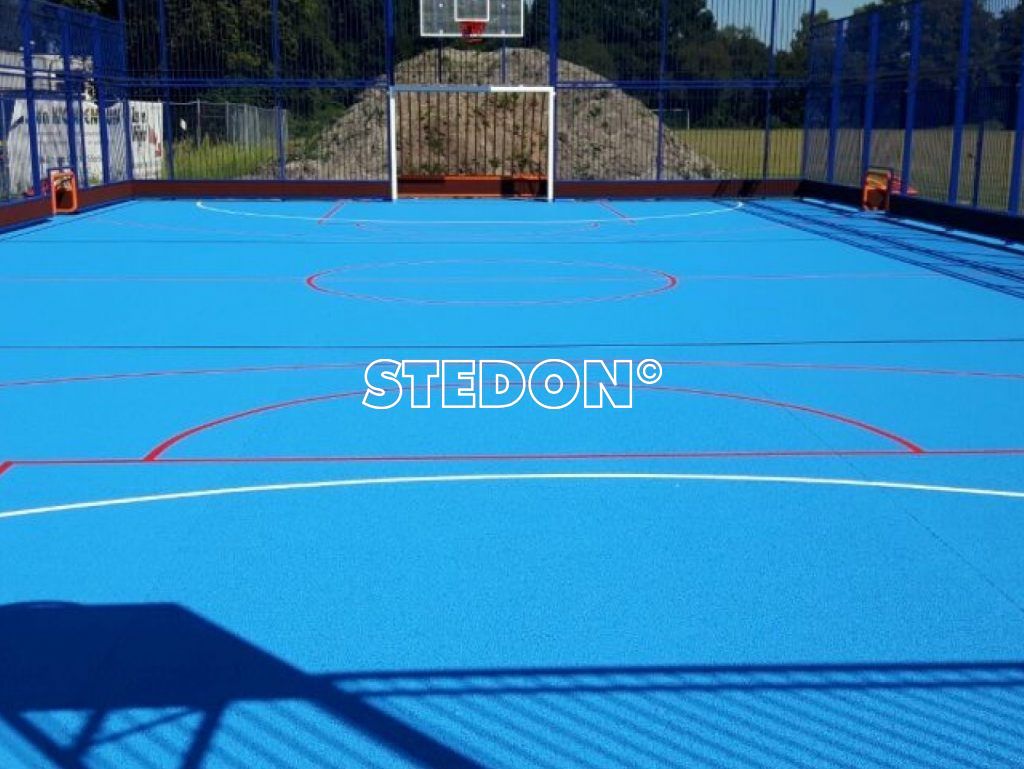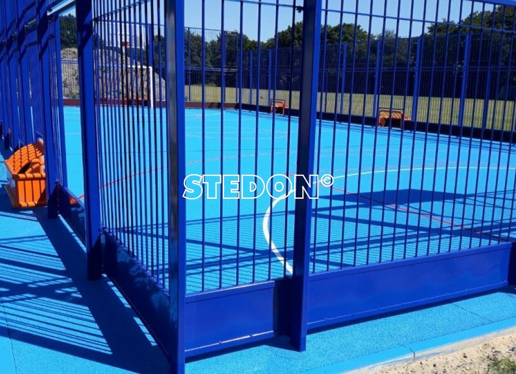 Een SSM sportkooi met hockeyboarding en drainbeton sportvloer. De belijning die is aangebracht is van voetbal en basketbal. Bovendien is er belijning aangebracht om drie pannavelden te maken.