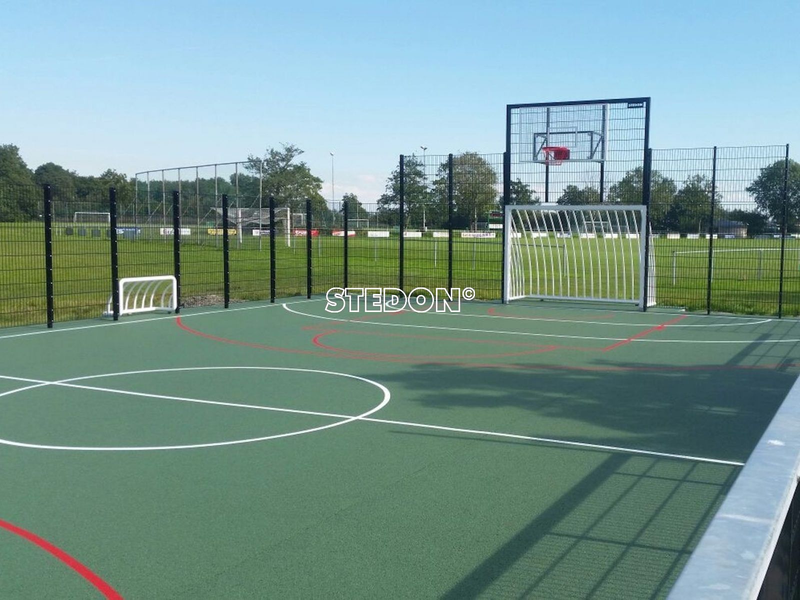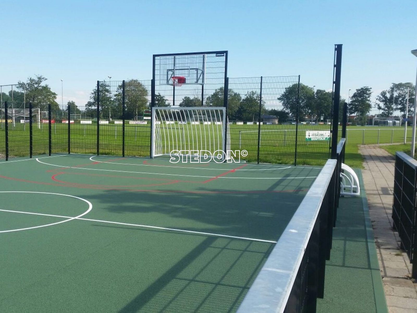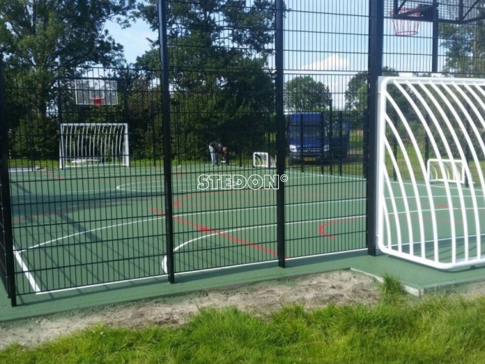 In Westgraafdijk heeft STEDON een DSM sportkooi geleverd met een groene drainbeton sportvloer. Op de vloer is voetbal en basket belijning aangebracht, elk in zijn eigen kleur.